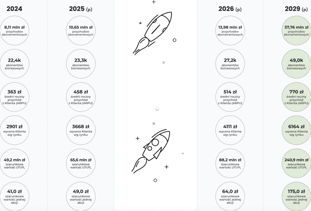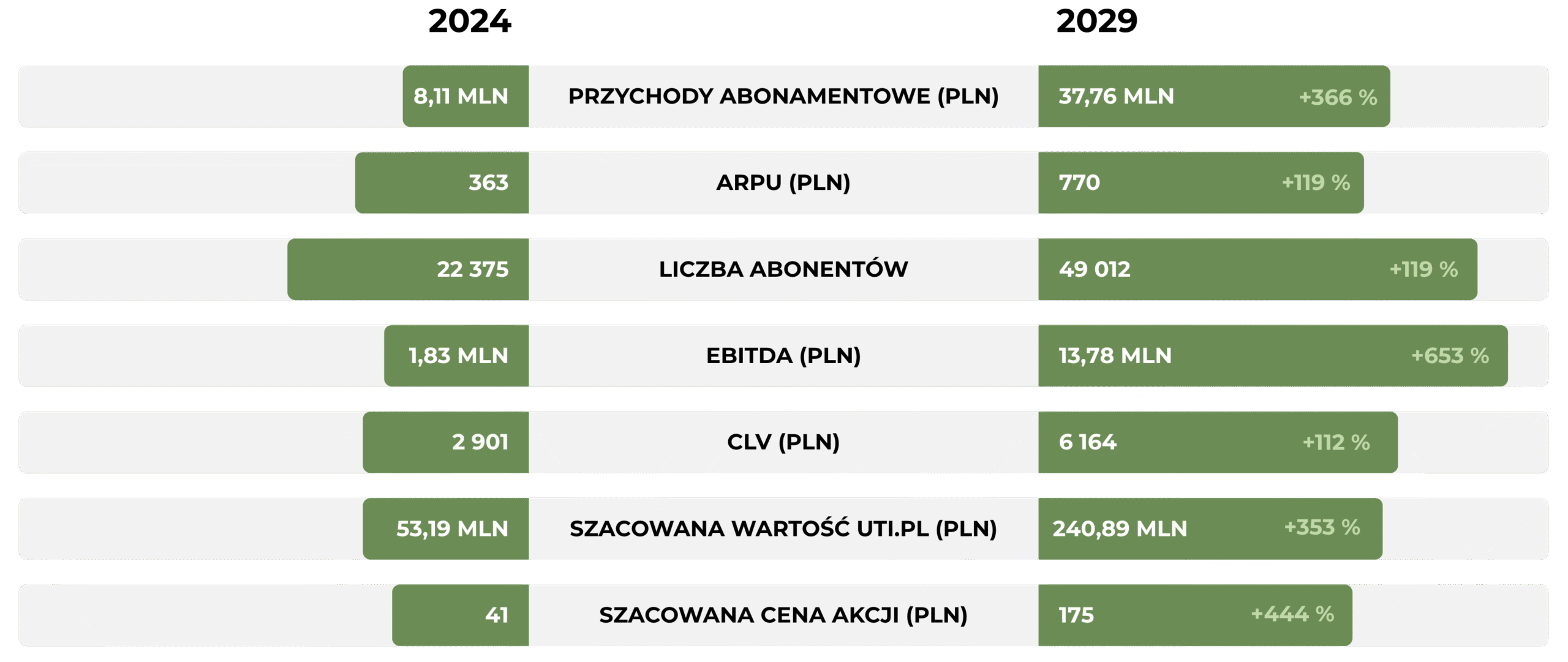 Prognozy pokazują, że w latach 2025–2029 przychody UTI.PL wzrosną o +255%, EBITDA o +390%, a wartość akcji nawet o +272%. To realna perspektywa ponadprzeciętnych stóp zwrotu, oparta na lojalnej bazie klientów, stabilnym modelu subskrypcyjnym i technologiach przyszłości.